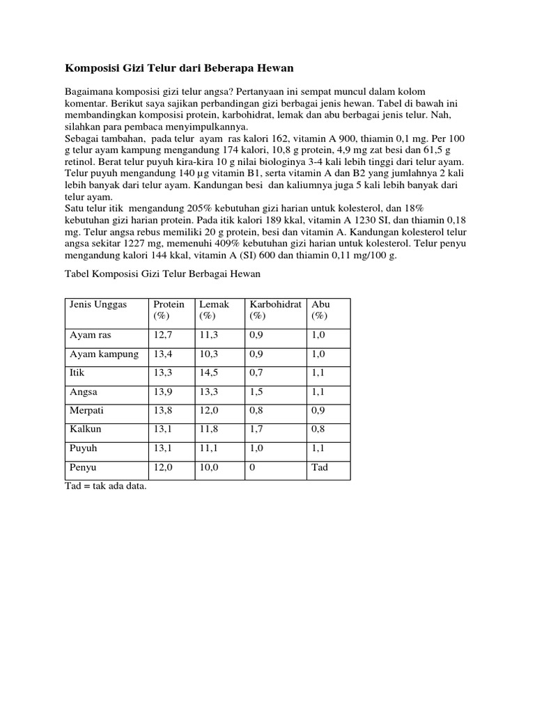 Perbandingan lemak telur ayam sebanyak 10,8gram dan telur itik 12,4gram (masing 2x didalam 100gram ) kadar kolestrol dan lemak lebih banyak di telur ayam. Namun, putih telur ayam cenderung mengandung lebih banyak protein seperti ovalbumin, conalbumin, dan. Telur bebek lebih lembut karena protein bertanggung jawab atas sifat pembusaan dan. Hanya telur bebek yang baik untuk dibuat telur asin, karena selain cagkangnya lebih. Kandungan protein telur bebek lebih banyak daripada telur ayam. Berikut perbandingan kandungan nutrisi kedua jenis telur ini, dilansir dari live strong, senin (13/7). Yuk, ketahui kandungan gizi telur dari berbagai jenis dengan membaca tulisan ini hingga tuntas! Kuning telur dikenal mengandung kadar kolesterol tinggi. Dikutip dari berbagai sumber, telur bebek mengandung jumlah nutrisi yang lebih banyak daripada telur ayam, seperti protein, lemak sehat, dan vitamin d. Di indonesia, telur ayam kebanyakan berwarna coklat. Sedangkan sebutir telur ayam mengandung 60 kalori, 5,5 gr protein, 0,3 gr karbohidrat, 60 mgnatrium, 60 mg kalium, 85 mg fosfor, dan 165 mg kolesterol. Telur ini sangat kaya akan vitamin b12 dan selenium. Telur bebek mengandung sedikit lebih banyak protein dibandingkan dengan telur ayam.